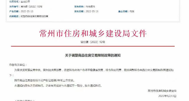 为坚决贯彻落实党中央、国务院决策部署,促进常州市房地产市场平稳健康发展,常州市对商品住房交易限制政策予以调整:常州市商品住房自取得不动产权证后满2年可上市交易。