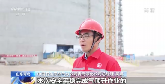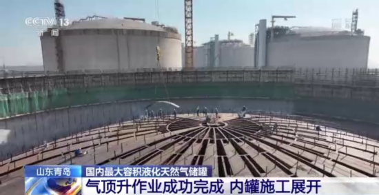 中国石化天然气分公司青岛液化公司总经理 吴斌:本次安全平稳完成气顶升作业的是国内首台27万(立)方(米)全容式液化天然气储罐,也是目前国内建设速度最快、容积最大的液化天然气储罐,(气顶升作业成功)标志着外罐主体结构基本完成,即将开始内罐施工。
