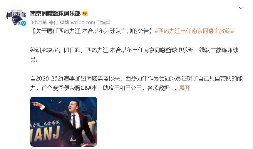 荔枝新闻讯 5月17日,南京同曦篮球俱乐部官方宣布西热力江担任球队主教练,同时兼任球员。