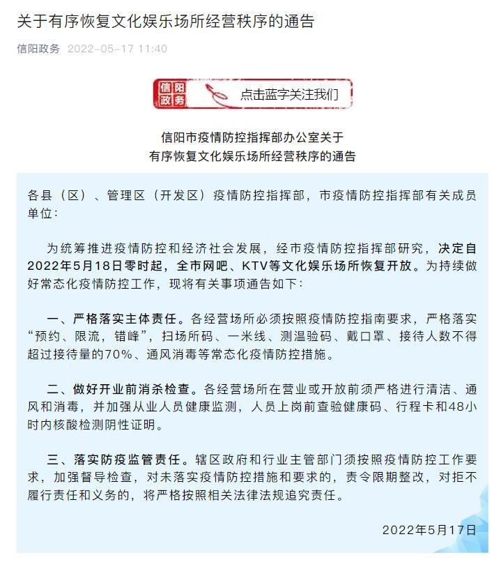 荔枝新闻讯 据信阳政务微信公众号5月17日消息,河南省信阳市疫情防控指挥部办公室发布关于有序恢复文化娱乐场所经营秩序的通告。全文如下: