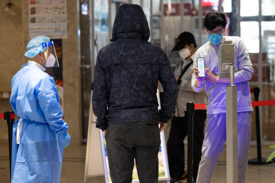 记者在门店外看到,十多名戴着口罩的顾客正在这里以“2米线”间隔的方式有序排队。门店入场口放置了“数字哨兵”系统,顾客扫码时,机器立即显示健康码、体温、抗原、核酸状况等,是否符合入场要求。