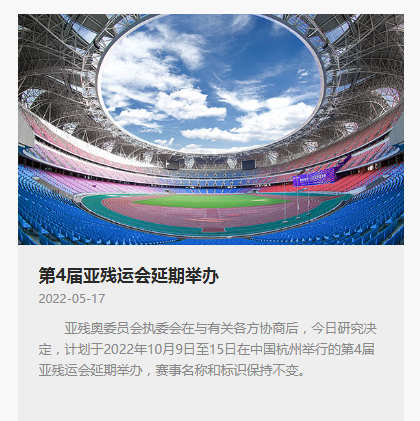 荔枝新闻讯 据杭州2022年亚残运会官网消息,亚残奥委员会执委会在与有关各方协商后,今日研究决定,计划于2022年10月9日至15日在中国杭州举行的第4届亚残运会延期举办,赛事名称和标识保持不变。新的举办日期将由亚残奥委员会、中国残奥委员会、杭州亚残组委协商一致后对外公布。