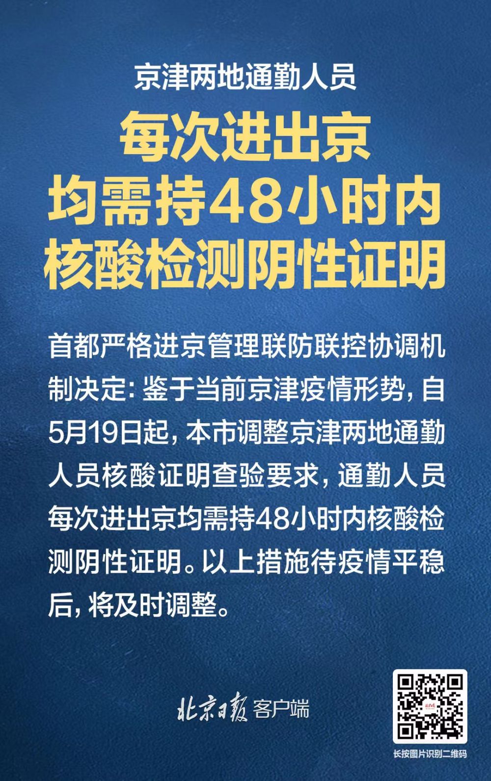 首都严格进京管理联防联控协调机制决定:鉴于当前京津疫情形势,自5月19日起,本市调整京津两地通勤人员核酸证明查验要求,通勤人员每次进出京均需持48小时内核酸检测阴性证明。以上措施待疫情平稳后,将及时调整。