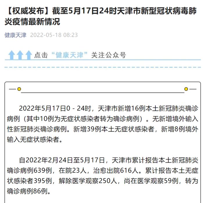自2022年2月24日至5月17日,天津市累计报告本土新冠肺炎确诊病例639例,在院23人,治愈出院616人。累计报告本土无症状感染者395例,解除医学观察250人,尚在医学观察59例,转为确诊病例86例。