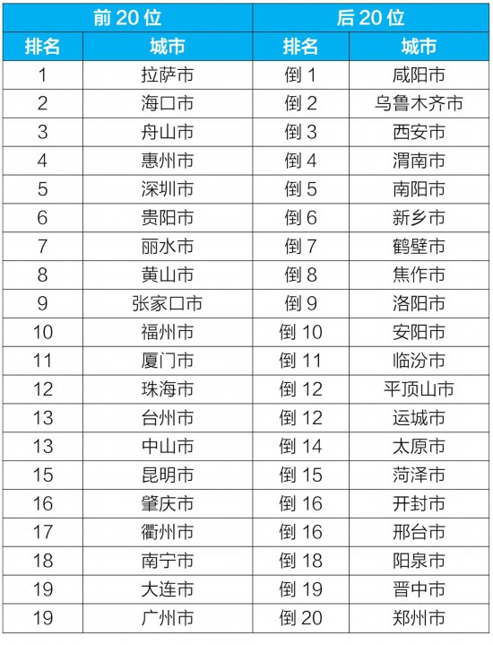 1—4月,168个重点城市中,拉萨、海口和舟山市等20个城市空气质量相对较好(从第1名至并列第19名);咸阳、乌鲁木齐和西安市等20个城市空气质量相对较差(从倒数第1名至倒数第20名),见附表2。
