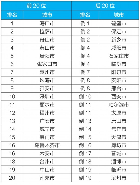 4月,168个重点城市中,海口、拉萨和舟山市等20个城市空气质量相对较好(从第1名至第20名);鹤壁、保定和新乡市等20个城市空气质量相对较差(从倒数第1名至并列倒数第19名),见附表1。