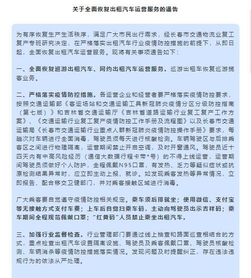 通告要求,严格落实疫情防控措施。各运营企业和经营者要严格落实疫情防控要求,按照交通运输部《客运场站和交通运输工具新冠肺炎疫情分区分级防控指南(第七版)》和吉林省交通运输厅《吉林省道路运输行业复工复产工作方案》、《交通运输行业复工复产疫情防控工作手册及流程图》以及长春市交通运输局《长春市交通运输行业重点人群新冠肺炎疫情防控操作手册》要求,每趟次对车辆进行全面消毒,驾驶员须每天进行核酸检测。车辆驾驶区与后排乘客区之间进行物理隔离,运营期间禁止开启空调,及时开窗通风。驾驶员近十四天内有中高风险经历(通信大数据行程卡带*号)的不得上线运营,运营期间驾驶员须做好个人防护,全程佩戴N95口罩,有发热、乏力等疑似症状或抗原检测结果异常时,应立即主动上报、就诊。如发现乘客发热等异常情况,立即报告、配合移交卫健部门,并对乘客接触区域进行消毒。