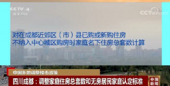 16日,成都发布最新房地产调控政策,调整家庭住房总套数认定标准和无房居民家庭认定标准,对在成都近郊区(市)县已购或新购住房,不纳入中心城区购房时家庭名下住房总套数计算。将无房居民家庭认定标准从“2016年10月1日开始,在成都市没有住房转让交易记录”调整为“登记购房之日前2年内无住房转让记录”。