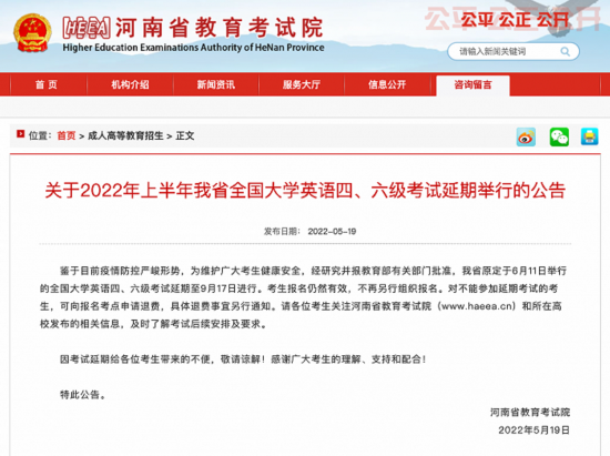 荔枝新闻讯 据河南省教育考试院网站5月19日发布公告称,鉴于目前疫情防控严峻形势,为维护广大考生健康安全,经研究并报教育部有关部门批准,河南省原定于6月11日举行的全国大学英语四、六级考试延期至9月17日进行。考生报名仍然有效,不再另行组织报名。对不能参加延期考试的考生,可向报名考点申请退费,具体退费事宜另行通知。请各位考生关注河南省教育考试院(www.haeea.cn)和所在高校发布的相关信息,及时了解考试后续安排及要求。