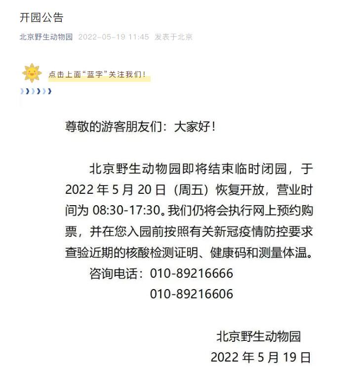 荔枝新闻讯 北京野生动物园微信公众号今日(5月19日)发布开园公告:北京野生动物园即将结束临时闭园,于2022年5月20日(周五)恢复开放。全文如下: