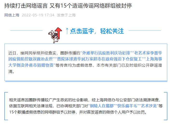 相关谣言因圈群传播较广产生恶劣的社会影响,经上海网信办与公安部门依法溯源调查,依据互联网相关法律法规,已协调相关部门对“铜陵人在魔都”“快乐薅羊毛”“艺术沙龙” 等15个散播虚假信息的网络群组予以封停,并对首发谣言的微信个人用户予以处罚。