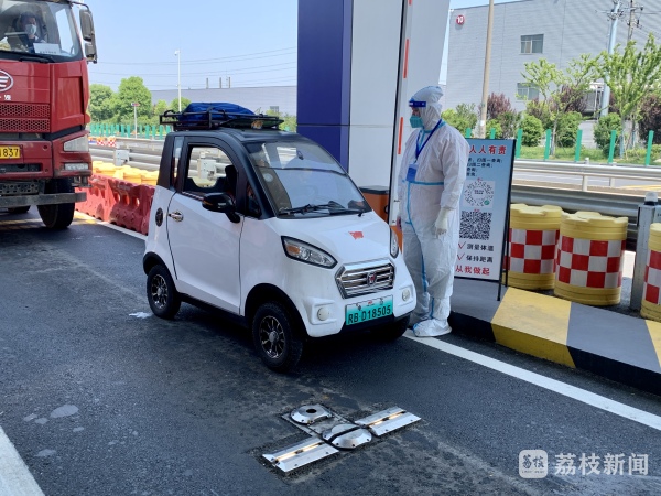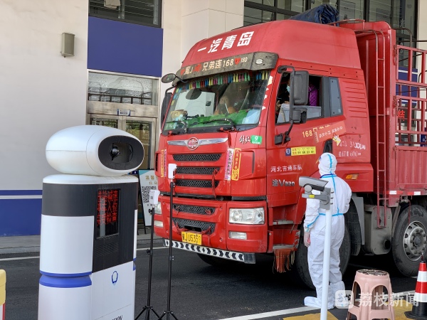 放眼这个3层楼高的公路检查站,蓝白楼体外警灯闪烁,疫情防控须知滚动播放,两条检查通道设有4个点位,通道内一辆辆汽车正排队有序接受人工核查。记者注意到,通道处各设置一个金属装置,汽车经过时即会亮灯,通过人工审核后还将接受通道前段两台机器人识别,无异常后方可通行。