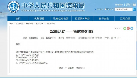 威海海事局发布航行警告,5月20日至5月22日每日10时至14时,黄海部分海域进行军事活动,禁止驶入。(中国海事局网站)