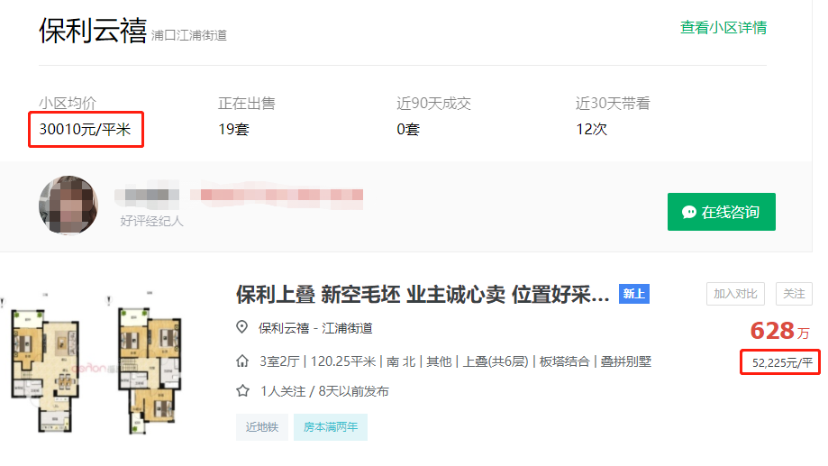 在江北的雨山路板块,保利云禧的一套二手房直接将房价报到了“5”字头,着实令人咋舌。该房源的面积为120平方米,挂牌价为628万,单价52225元/㎡。而在链家的统计数据中,该小区的均价只有30010元/㎡,今年以来的二手房挂牌价多数在36000元-42000元/㎡之间。