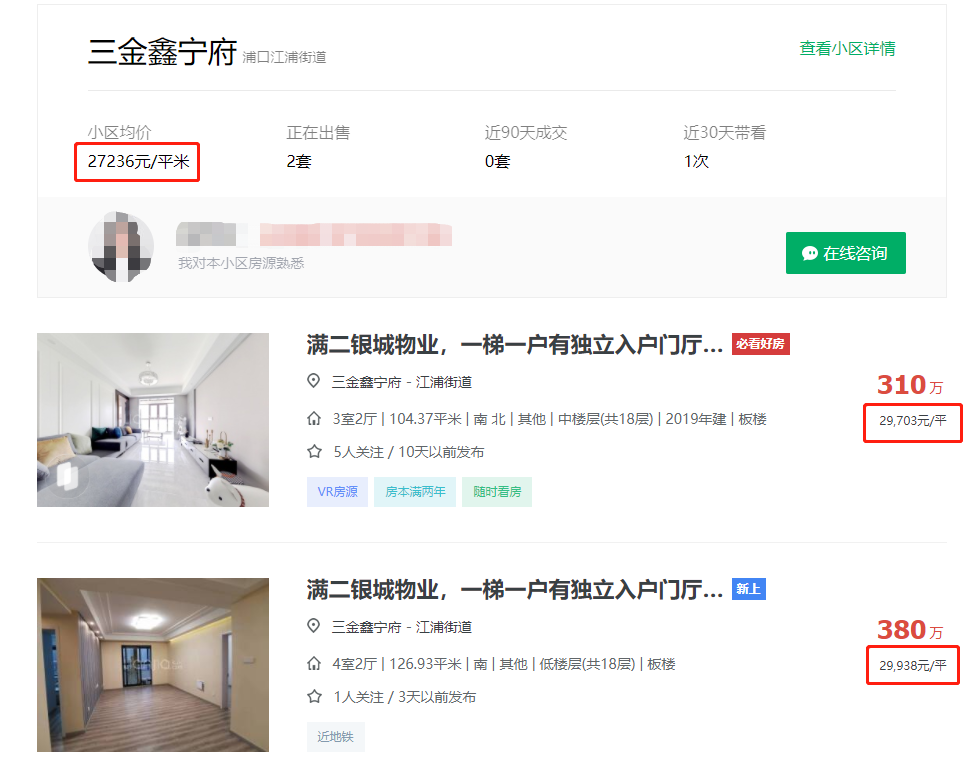 记者在链家的江北江浦板块中,发现两套5月中旬刚刚上线的三金鑫宁府的房源,其中一套面积为104平方米的二手房,房主报价310万,单价为29703元/㎡;另一套126平方米的报价为380万,单价高达29938元/㎡。记者发现,该小区的历史均价为27236元/㎡,这两套房源的挂牌价上涨了2000多元/㎡。来自中海万锦熙岸的一套房源于5月19日“新鲜”上架,面积167平方米,报价497万,单价为29604元/㎡,比该小区25000元/㎡左右的均价,上调了4000多元/㎡。