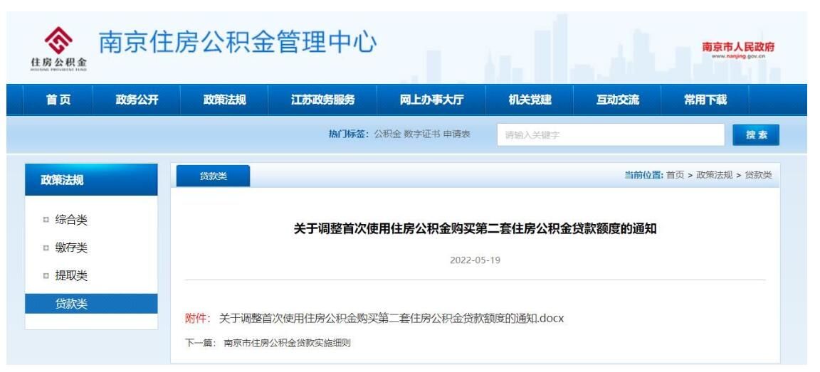 为满足住房公积金缴存职工合理住房需求,充分发挥住房公积金的住房民生保障作用,经南京住房公积金管理委员会2022年第一次会议审议批准,自2022年5月20日起,调整南京市首次使用住房公积金贷款购买第二套房住房公积金贷款最高限额,现将具体内容通知如下: