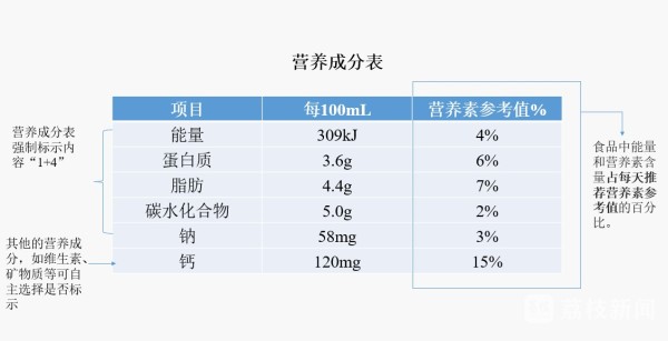 第一列的能量、蛋白质、脂肪、碳水化合物及钠,属于强制标示内容,其他营养成分如维生素、钙等,由企业自主选择是否标示。
