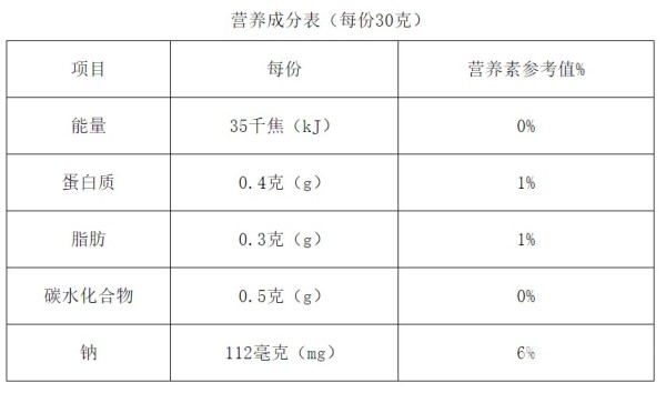 例如这款腌渍萝卜条,该标签中营养标签用“份”作为计量单位,每30g钠含量112mg,即每100g钠含量约为373mg。