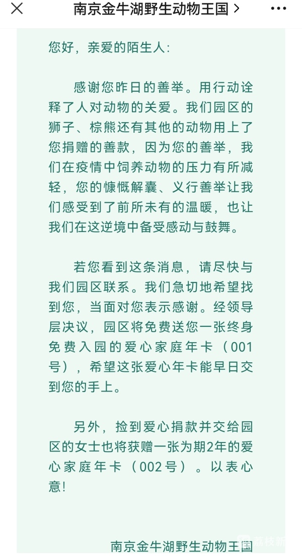 5月20日,南京金牛湖野生动物王国发布了一条“寻找匿名捐赠人”的公告,引发市民热议。