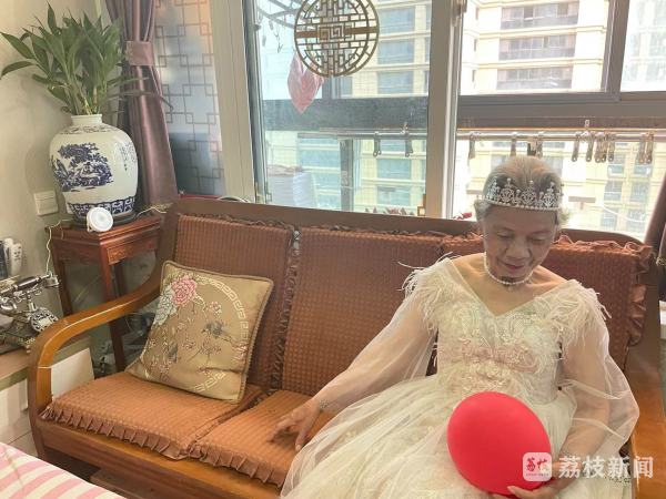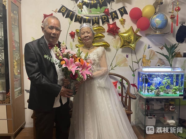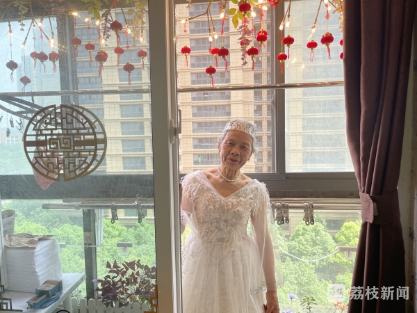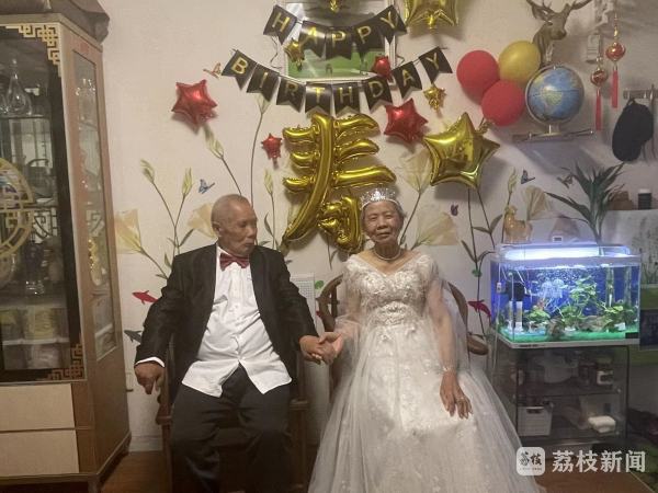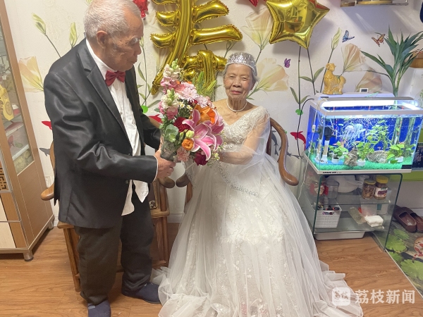 前两天刚过完百岁生日的李前龙和他的老伴在“520”这天赶了个时髦。20日上午91岁的戴桂兰坐在自家客厅里,穿着雪白的曳地婚纱,耳环、项链、戒指一个不少。100岁的李前龙身穿西装,打着领结。镜头下,憨厚的笑容看起来特别温暖。