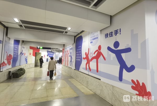 代表不同职业的卡通形象元素充满车站,见义勇为宣传标语随处可见,进出站的乘客纷纷在通道漫画墙前驻足停留,不少人手持宣传册和鲜花,在漫画墙前合影留念。