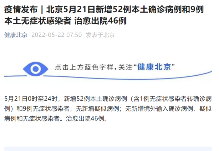 荔枝新闻讯 据“健康北京”微信号消息,5月21日0时至24时,北京新增52例本土确诊病例(含1例无症状感染者转确诊病例)和9例无症状感染者,无新增疑似病例;无新增境外输入确诊病例、疑似病例和无症状感染者。治愈出院46例。