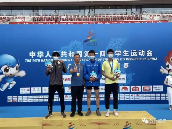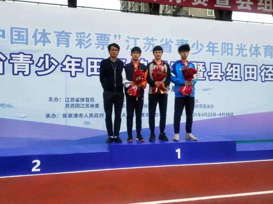 ▲2021年4月,董子昂(右二)在江苏省县组田径比赛中以2.2米的成绩摘下跳高冠军,并创下江苏省县组田径比赛跳高最好成绩。