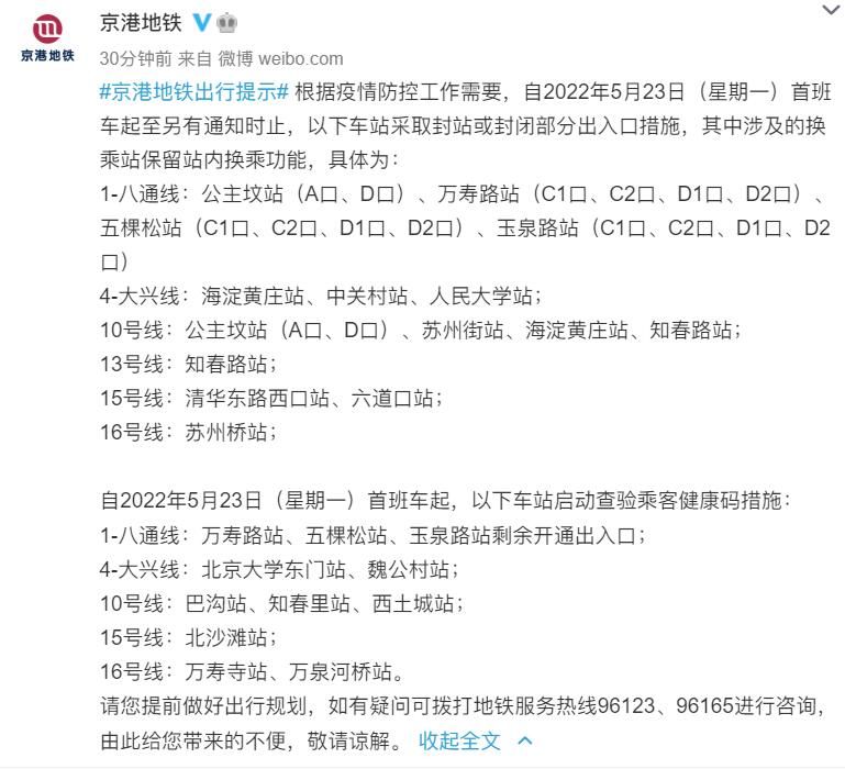 荔枝新闻讯 据@京港地铁 微博消息,根据疫情防控工作需要,自2022年5月23日(星期一)首班车起至另有通知时止,以下车站采取封站或封闭部分出入口措施,其中涉及的换乘站保留站内换乘功能,具体为: