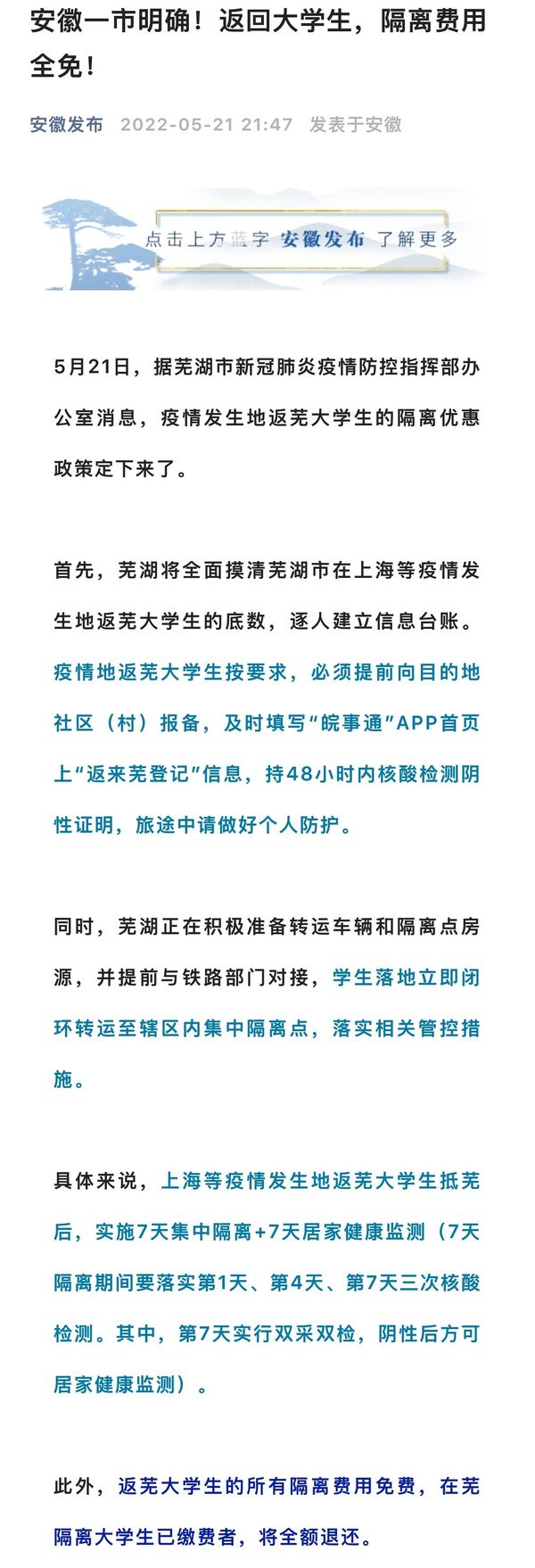 荔枝新闻讯 据“安徽发布”微信公众号消息, 5月21日,据芜湖市新冠肺炎疫情防控指挥部办公室消息,疫情发生地返芜大学生的隔离优惠政策定下来了。