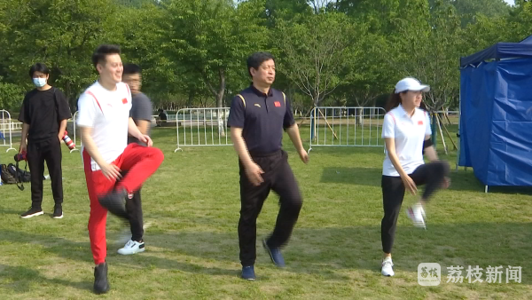 一大早,数百名跑友齐聚南京玄武湖情侣园,开启热身运动。伴随着音乐声,蹦床奥运冠军陆春龙、击剑奥运冠军骆晓娟、马拉松世界冠军周春秀和大家一起热身,欢乐动起来。