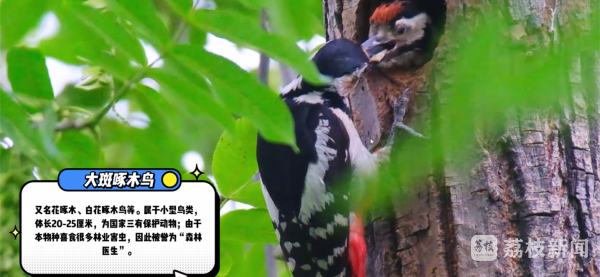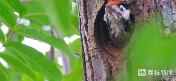 五月的玄武湖万物繁茂,生机勃勃。近日,在玄武湖十里长堤十里桥附近的一株槐树上,一只大斑啄木鸟正细心地喂食双胞胎,雏鸟藏身的树洞还引来了好奇八哥的围观。场面有趣,爱意满满!