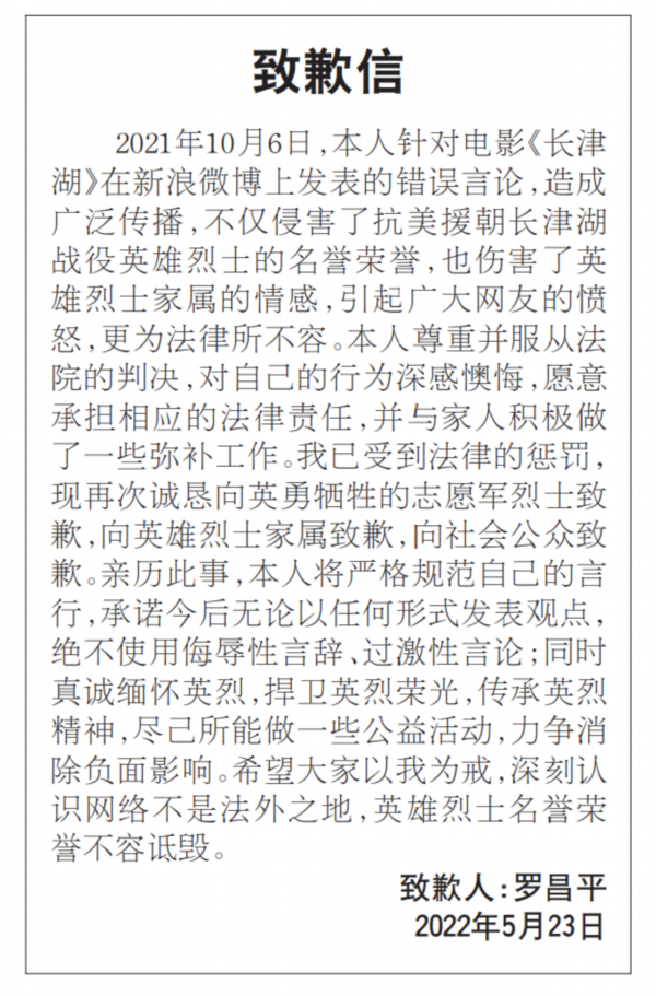 2021年10月6日,本人针对电影《长津湖》在新浪微博上发表的错误言论,造成广泛传播,不仅侵害了抗美援朝长津湖战役英雄烈士的名誉荣誉,也伤害了英雄烈士家属的情感,引起广大网友的愤怒,更为法律所不容。本人尊重并服从法院的判决,对自己的行为深感懊悔,愿意承担相应的法律责任,并与家人积极做了一些弥补工作。我已受到法律的惩罚,现再次诚恳向英勇牺牲的志愿军烈士致歉,向英雄烈士家属致歉,向社会公众致歉。亲历此事,本人将严格规范自己的言行,承诺今后无论以任何形式发表观点,绝不使用侮辱性言辞、过激性言论;同时真诚缅怀英烈,捍卫英烈荣光,传承英烈精神,尽己所能做一些公益活动,力争消除负面影响。希望大家以我为戒,深刻认识网络不是法外之地,英雄烈士名誉荣誉不容诋毁。