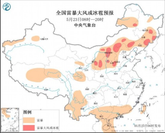 此外,今天,内蒙古中西部和东南部、黑龙江南部、吉林东部、辽宁东部和西北部、宁夏东部、陕西北部、山西中北部和东南部、河北北部和西南部等地的局地将有雷暴大风或冰雹天气。