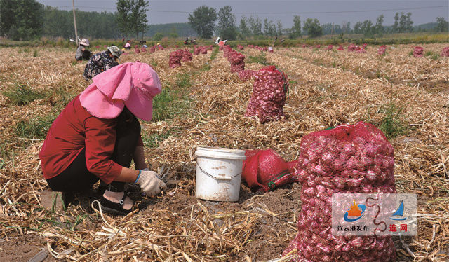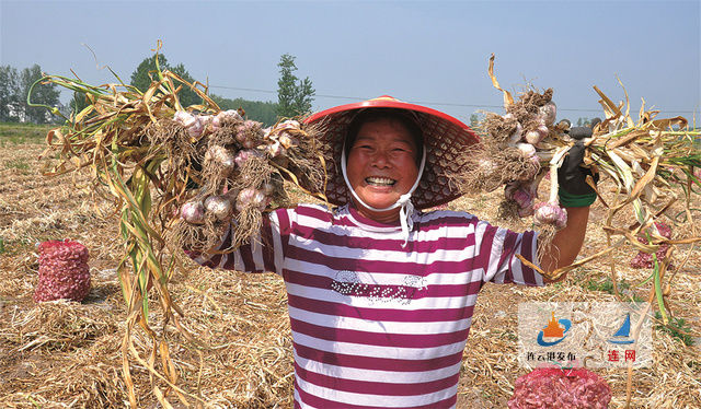 昨日上午,灌南县田楼镇农民抓住当前晴好天气有利时机正在抢收大蒜。目前,该镇种植的500余亩优质大蒜已进入收获季,亩均产量达2000公斤以上。(通讯员 王华 王晓华 摄影报道)