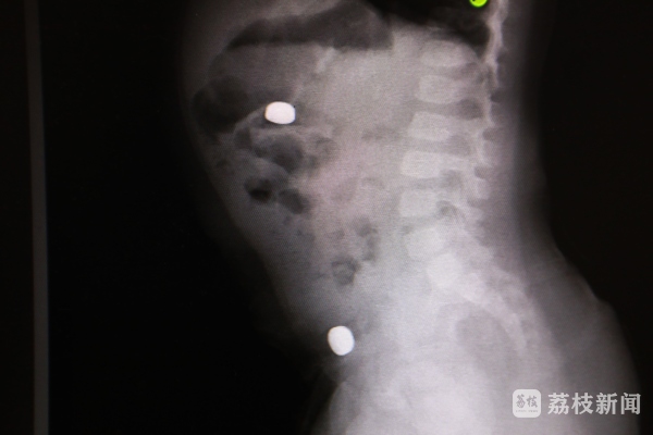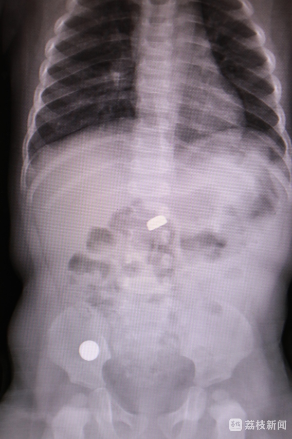 当晚,小天突然出现恶心、呕吐,还伴有腹痛,家人立即带其就医。医生查体发现,小天腹部发胀,有压痛和反跳痛,怀疑可能是异物所致。“做了腹部平片,发现腹腔里有两个光亮的影子。询问病史,家长高度怀疑是家里的纽扣电池被孩子吞了。”淮安市妇幼保健院小儿外科主治医师张岩说。