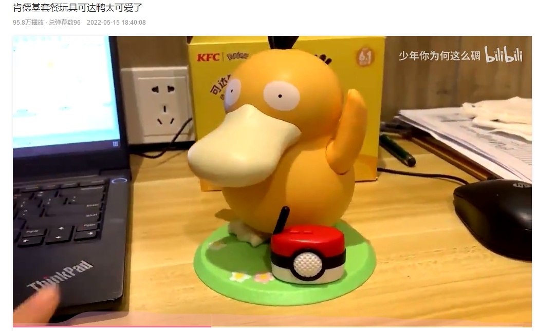 这个魔性的可达鸭,是肯德基5月21日推出的儿童节套餐搭配玩具之一。从其小程序可查询到,购买59-109元不等的指定套餐即可获得随机一款宝可梦联名玩具,可达鸭即为其中一款。中新经纬发现,可达鸭在网上爆红后,不仅多家肯德基门店玩具断货,二手市场还出现了“代吃”和炒作价格的现象。