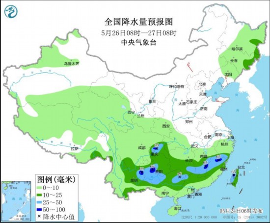 全国降水量预报图(5月25日08时-26日08时)