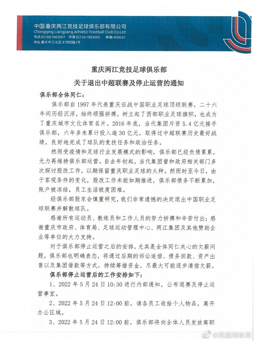 重庆两江竞技足球俱乐部关于退出中超联赛及停止运营的通知