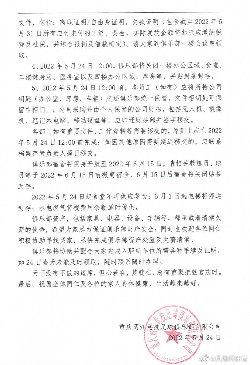 3、2022年5月24日12:00前,俱乐部将向全体人员发放离职文件,包括:离职证明/自由身证明,欠款证明(包含截至2022年5月31日所有应付未付的工资、奖金,实际发放金额将扣除应缴纳税费及社保,并综合报销及借款确定)。请大家到俱乐部一楼会议室领取。