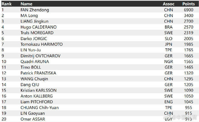 男单樊振东以6900分排名第一,马龙3400分位列次席,梁靖崑排名第三。巴西的卡尔德拉诺-雨果第四,世乒赛亚军瑞典的莫雷加德第五。斯洛文尼亚的乔吉奇第六,日本的张本智和第七。中国台北的林昀儒第八,德国名将奥恰洛夫第九,尼日利亚的阿鲁纳第十。值得一提的是,樊振东已经累计42个月世界排名第一,并且从2020年4月至今,连续25个月保持世界第一。