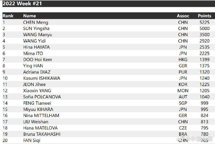 女单方面,陈梦以5225分占据榜首位置,孙颖莎5000分紧随其后,王曼昱第三王艺迪第四。两位日本选手早田希娜和伊藤美诚分列第五和第六,中国香港的杜凯琹第七,德国华裔名将韩莹第八,波多黎各的迪亚兹排在第九,石川佳纯第十。