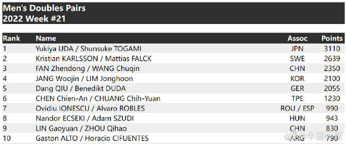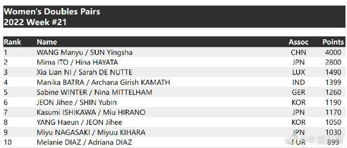 女双世乒赛冠军王曼昱/孙颖莎高居第一,日本组合伊藤美诚/早田希娜和卢森堡组合倪夏莲/德努特分列第二和第三。日本组合戸上隼輔/宇田幸矢在男双排名榜上位列头名位置,瑞典的世乒赛冠军组合卡尔森/法尔克排在第二,樊振东/王楚钦位列第三。