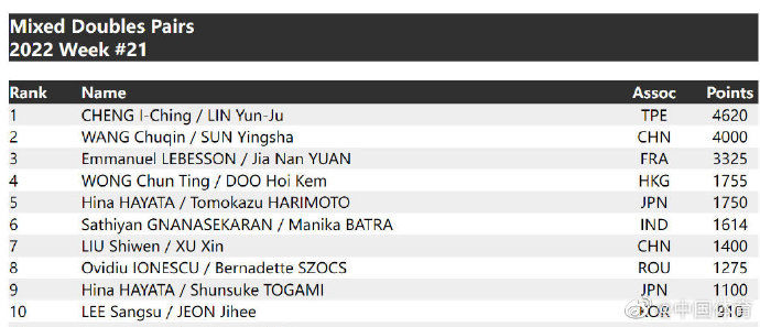 混双方面,中国台北组合郑怡静/林昀儒排名第一,世乒赛冠军王楚钦/孙颖莎排名第二,法国组合莱贝松/袁嘉楠位居第三,刘诗雯/许昕第七。