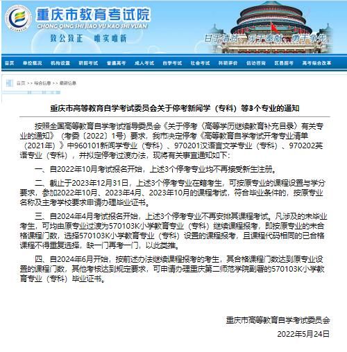 荔枝新闻讯 据重庆市教育考试院官网消息,按照全国高等教育自学考试指导委员会《关于停考〈高等学历继续教育补充目录〉有关专业的通知》(考委〔2022〕1号)要求,重庆市决定停考《高等教育自学考试开考专业清单(2021年)》中960101新闻学专业(专科)、970201汉语言文学专业(专科)、970202英语专业(专科),并拟定停考过渡办法,现将有关事宜通知如下: