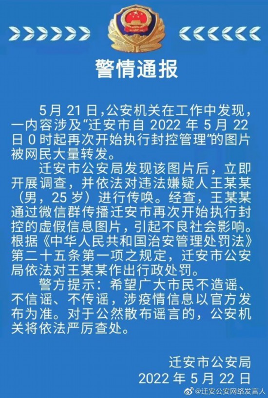 荔枝新闻讯 据@迁安公安网络发言人 微博消息,迁安市公安局5月22日发布警情通报称,5月21日,公安机关在工作中发现,一内容涉及“迁安市自2022年5月22日0时起再次开始执行封控管理”的图片被网民大量转发。