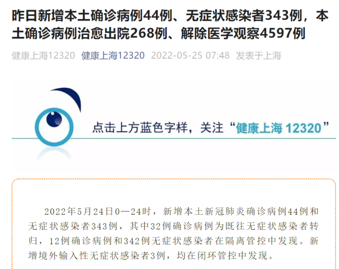 荔枝新闻讯 上海市卫健委今早(25日)通报:2022年5月24日0—24时,新增本土新冠肺炎确诊病例44例和无症状感染者343例,其中32例确诊病例为既往无症状感染者转归,12例确诊病例和342例无症状感染者在隔离管控中发现。新增境外输入性无症状感染者3例,均在闭环管控中发现。