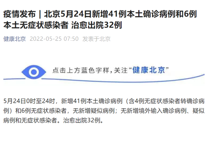 荔枝新闻讯 5月24日0时至24时,北京新增41例本土确诊病例(含4例无症状感染者转确诊病例)和6例无症状感染者,无新增疑似病例;无新增境外输入确诊病例、疑似病例和无症状感染者。治愈出院32例。