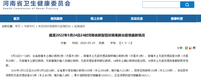 2020年1月21日至2022年5月24日24时,河南省累计报告确诊病例3165例(本土2954例、境外输入211例),现有住院病例130例(本土130例),尚在医学观察的无症状感染者471例(本土467例,境外输入4例)。累计追踪到密切接触者126803人,正在观察的密切接触者9415人。