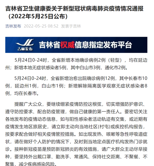 5月24日0-24时,吉林省新增治愈出院确诊病例12例,其中长春市10例,延边州1例,白山市1例;新增解除隔离医学观察无症状感染者8例,均在长春市。