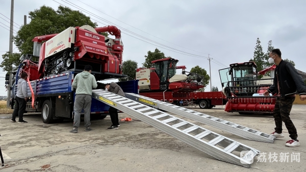 在辛庄镇合泰村,农机手小心翼翼地驾驶这些“大家伙”从货车上下到地面,这是前天晚上到达常熟的3台收割机,承接了合泰村周边2000多亩小麦收割订单,今天开始下田作业。苏州戈雅生态农业有限公司负责人周大平说:“我早就做好了预案,在这边小麦收割前,提前一个月就组织这些农机手。防疫措施都给他们做好,然后组织培训,农机下田作业,安全第一。”